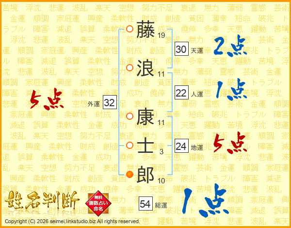 藤(19画)浪(11画) 康(11画)士(3画)郎(10画)