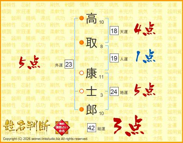 高(10画)取(8画) 康(11画)士(3画)郎(10画)