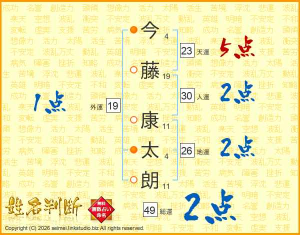 今(4画)藤(19画) 康(11画)太(4画)朗(11画)