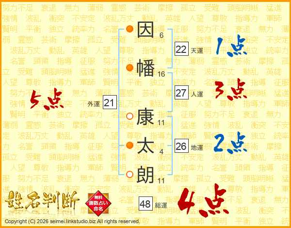 因(6画)幡(16画) 康(11画)太(4画)朗(11画)