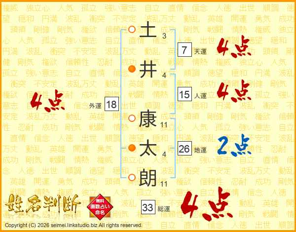 土(3画)井(4画) 康(11画)太(4画)朗(11画)