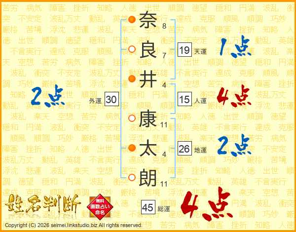 奈(8画)良(7画)井(4画) 康(11画)太(4画)朗(11画)