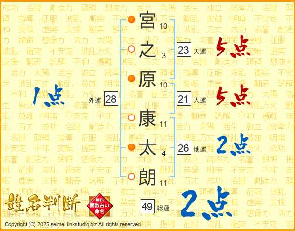 宮(10画)之(3画)原(10画) 康(11画)太(4画)朗(11画)