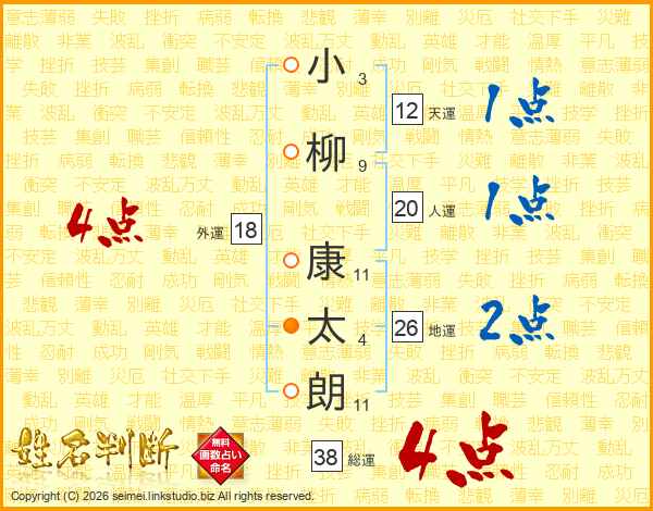 小(3画)柳(9画) 康(11画)太(4画)朗(11画)