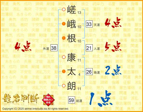 嵯(13画)峨(10画)根(10画) 康(11画)太(4画)朗(11画)