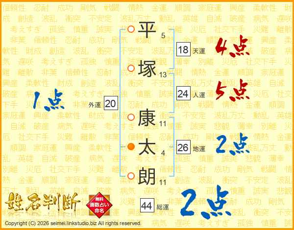 平塚康太朗さんの総運は44画の2点!