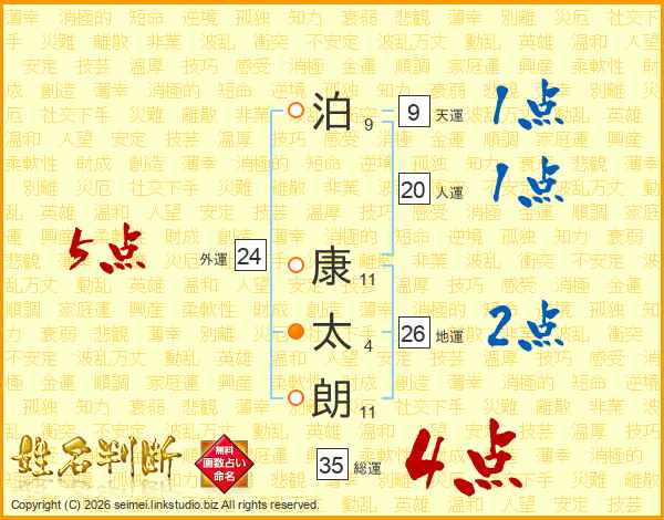 泊(9画) 康(11画)太(4画)朗(11画)