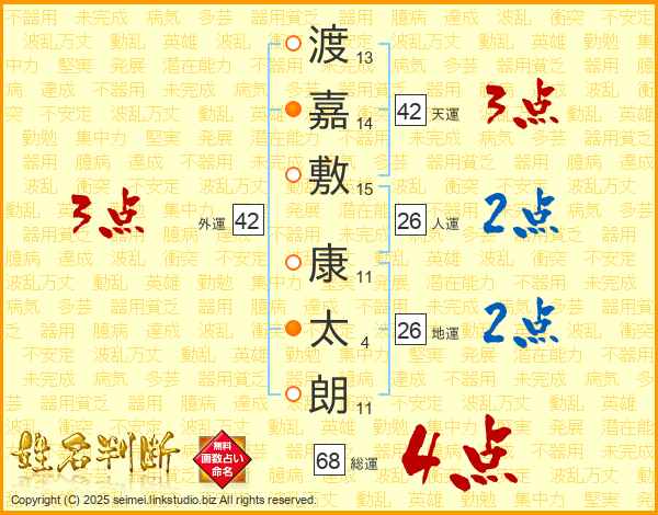 渡(13画)嘉(14画)敷(15画) 康(11画)太(4画)朗(11画)