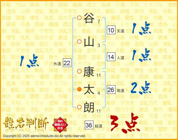 谷(7画)山(3画) 康(11画)太(4画)朗(11画)