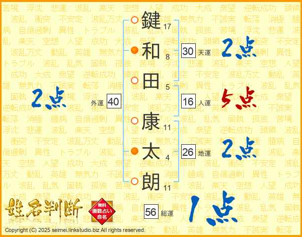 鍵(17画)和(8画)田(5画) 康(11画)太(4画)朗(11画)