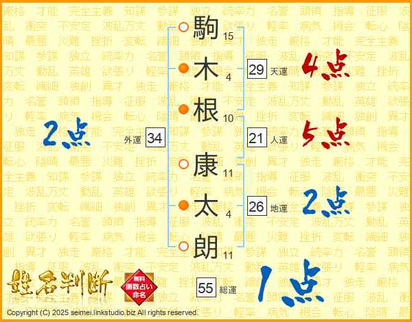駒(15画)木(4画)根(10画) 康(11画)太(4画)朗(11画)