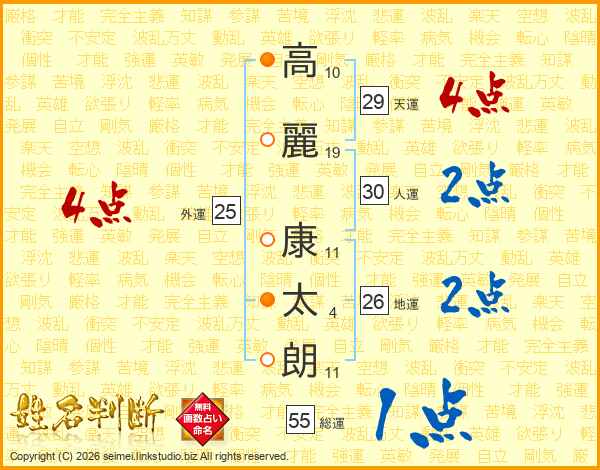 高(10画)麗(19画) 康(11画)太(4画)朗(11画)
