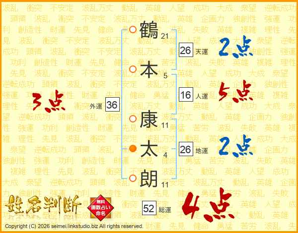 鶴(21画)本(5画) 康(11画)太(4画)朗(11画)