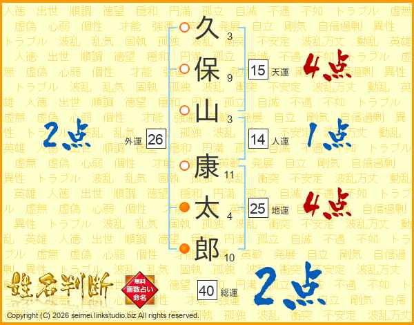 久(3画)保(9画)山(3画) 康(11画)太(4画)郎(10画)