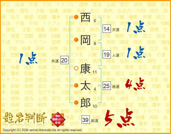 西岡康太郎さんの総運は39画の5点!