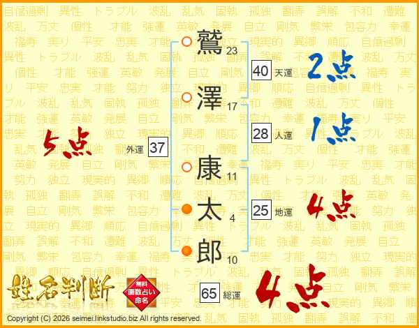 鷲(23画)澤(17画) 康(11画)太(4画)郎(10画)