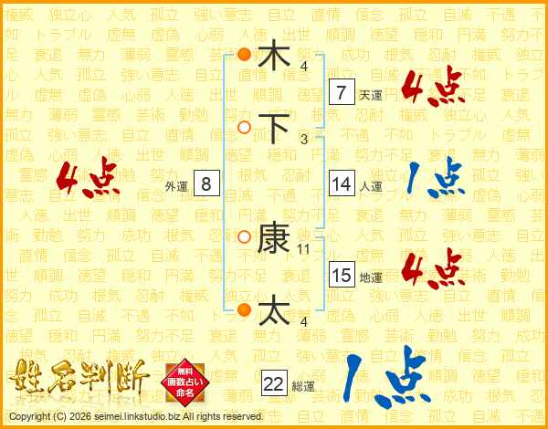 生活面を象徴する運勢です。外部から受ける影響力を表し、結婚運、家庭運や職場、環境への順応性を表します。総運から人運を引いた画数。姓や名が1文字の場合を除く。