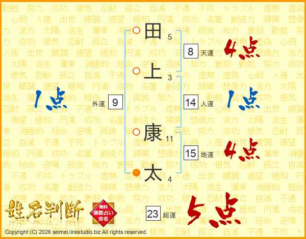 生活面を象徴する運勢です。外部から受ける影響力を表し、結婚運、家庭運や職場、環境への順応性を表します。総運から人運を引いた画数。姓や名が1文字の場合を除く。