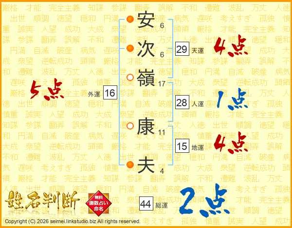 安(6画)次(6画)嶺(17画) 康(11画)夫(4画)