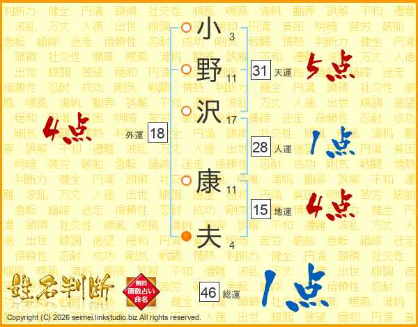 小(3画)野(11画)沢(17画) 康(11画)夫(4画)