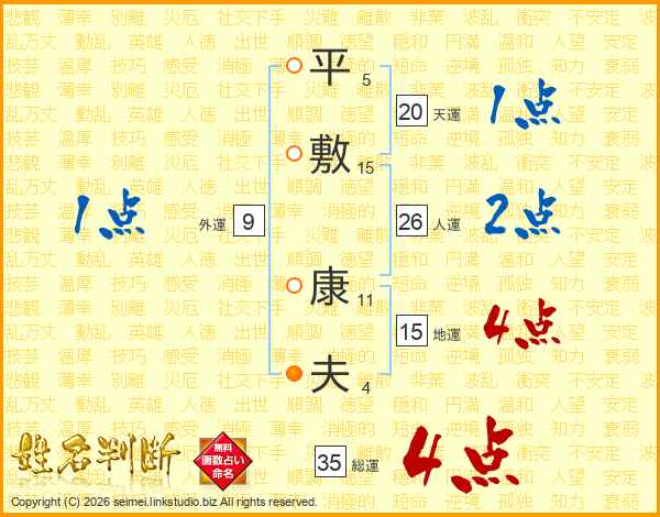 平(5画)敷(15画) 康(11画)夫(4画)