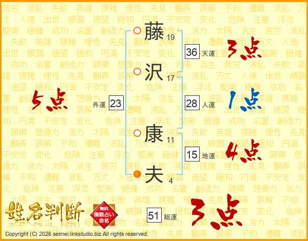 藤(19画)沢(17画) 康(11画)夫(4画)
