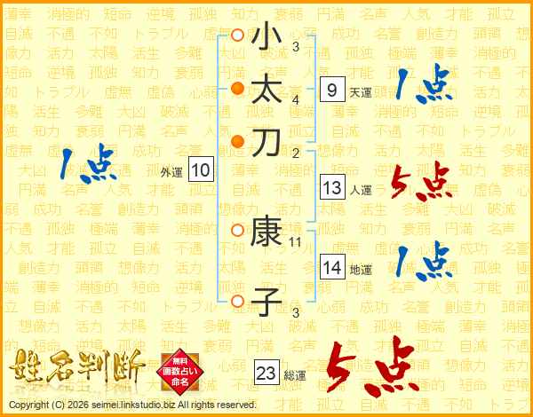 小(3画)太(4画)刀(2画) 康(11画)子(3画)