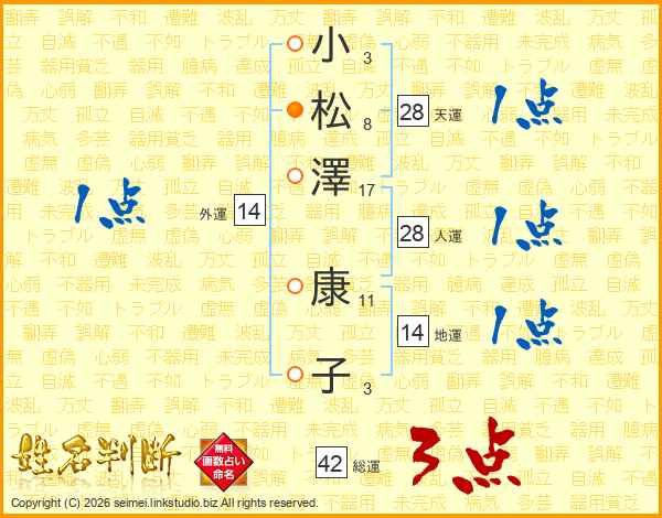 小(3画)松(8画)澤(17画) 康(11画)子(3画)