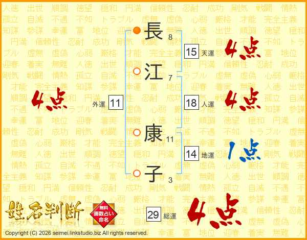 あなたの人生を表す1番重要な運勢です。生涯を通じて影響する総合運となり、主に50歳以降の晩年期に影響を及ぼします。苗字と名前の合計画数。