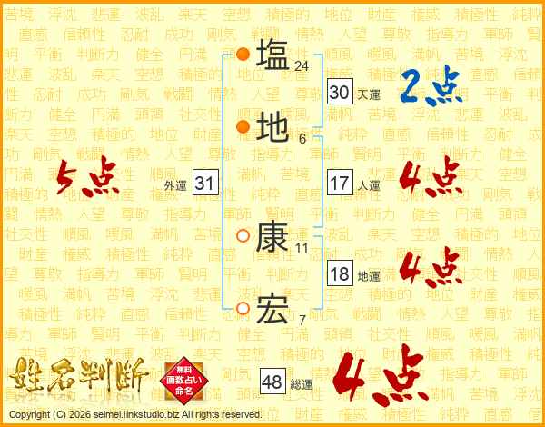 生活面を象徴する運勢です。外部から受ける影響力を表し、結婚運、家庭運や職場、環境への順応性を表します。総運から人運を引いた画数。姓や名が1文字の場合を除く。