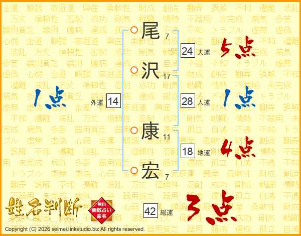 尾(7画)沢(17画) 康(11画)宏(7画)