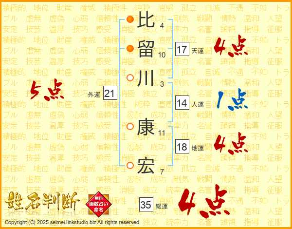 比(4画)留(10画)川(3画) 康(11画)宏(7画)