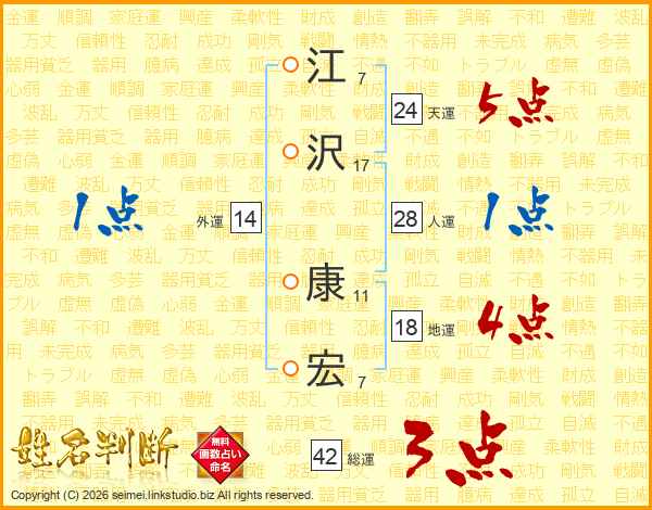 江(7画)沢(17画) 康(11画)宏(7画)