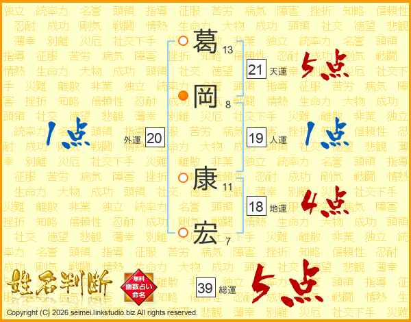葛(13画)岡(8画) 康(11画)宏(7画)