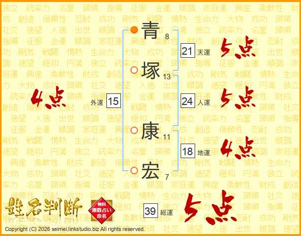 あなたの人生を表す1番重要な運勢です。生涯を通じて影響する総合運となり、主に50歳以降の晩年期に影響を及ぼします。苗字と名前の合計画数。