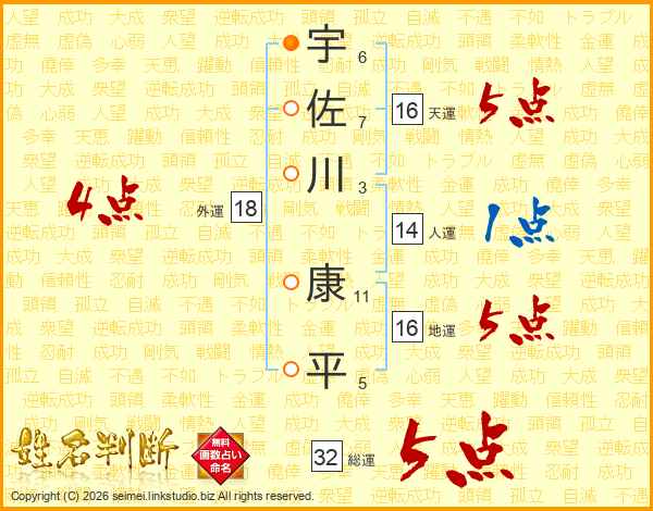 宇(6画)佐(7画)川(3画) 康(11画)平(5画)