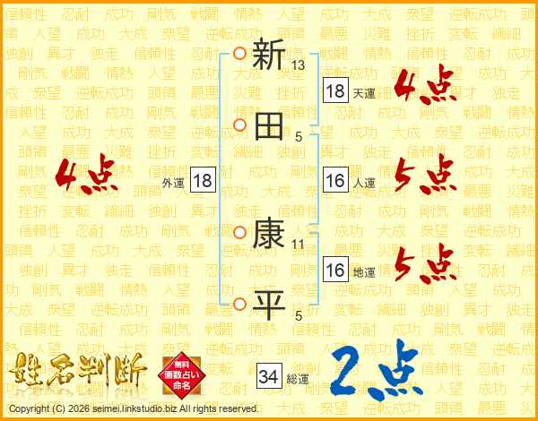 あなたの人生を表す1番重要な運勢です。生涯を通じて影響する総合運となり、主に50歳以降の晩年期に影響を及ぼします。苗字と名前の合計画数。