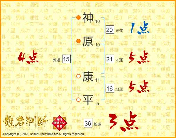 生活面を象徴する運勢です。外部から受ける影響力を表し、結婚運、家庭運や職場、環境への順応性を表します。総運から人運を引いた画数。姓や名が1文字の場合を除く。