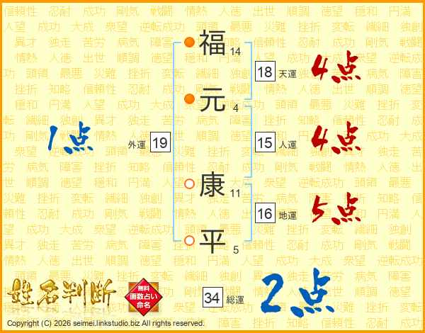 福(14画)元(4画) 康(11画)平(5画)