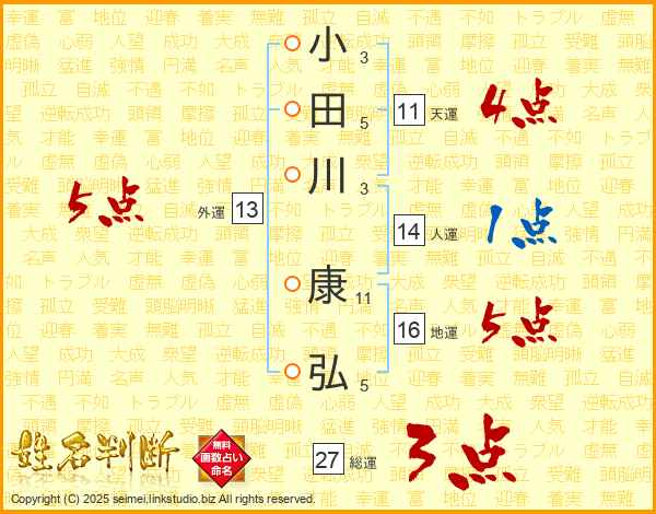 小(3画)田(5画)川(3画) 康(11画)弘(5画)