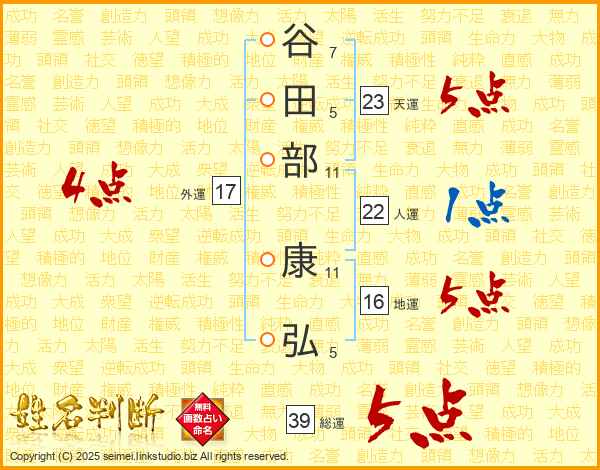 谷(7画)田(5画)部(11画) 康(11画)弘(5画)