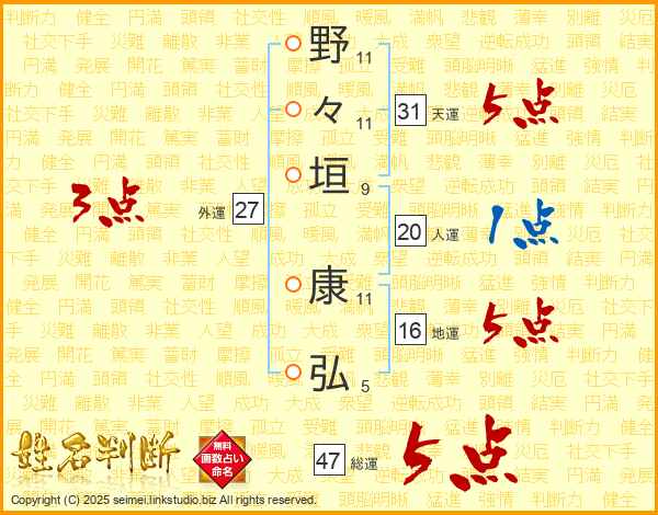 野(11画)々(11画)垣(9画) 康(11画)弘(5画)