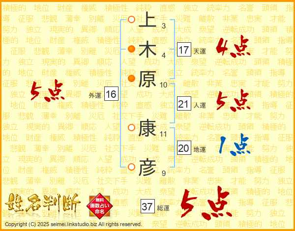 上(3画)木(4画)原(10画) 康(11画)彦(9画)