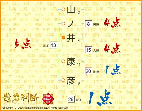 山(3画)ノ(1画)井(4画) 康(11画)彦(9画)