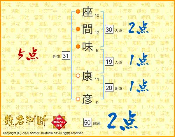 座(10画)間(12画)味(8画) 康(11画)彦(9画)