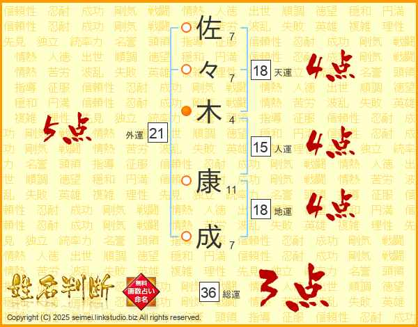 佐(7画)々(7画)木(4画) 康(11画)成(7画)