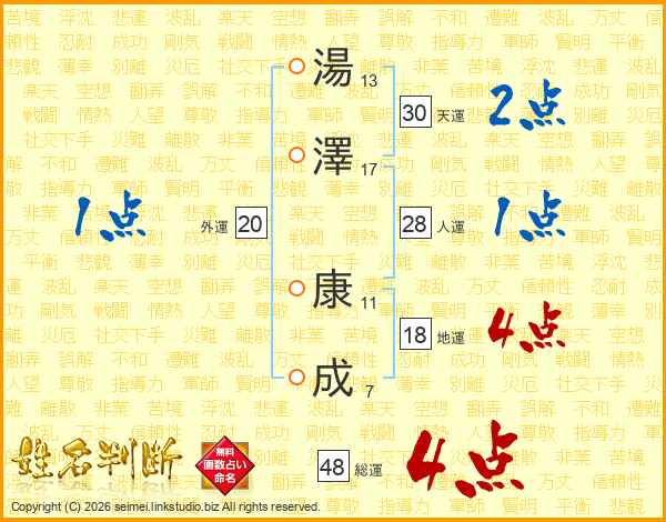 生活面を象徴する運勢です。外部から受ける影響力を表し、結婚運、家庭運や職場、環境への順応性を表します。総運から人運を引いた画数。姓や名が1文字の場合を除く。