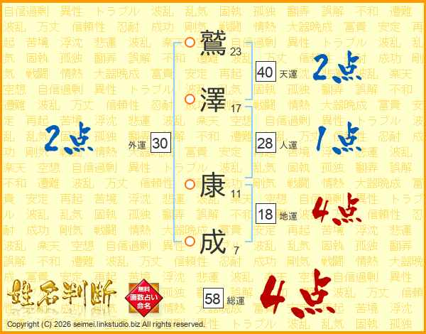 鷲(23画)澤(17画) 康(11画)成(7画)