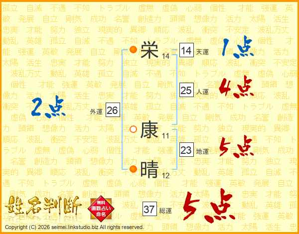 栄(14画) 康(11画)晴(12画)