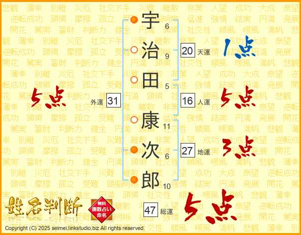 宇(6画)治(9画)田(5画) 康(11画)次(6画)郎(10画)